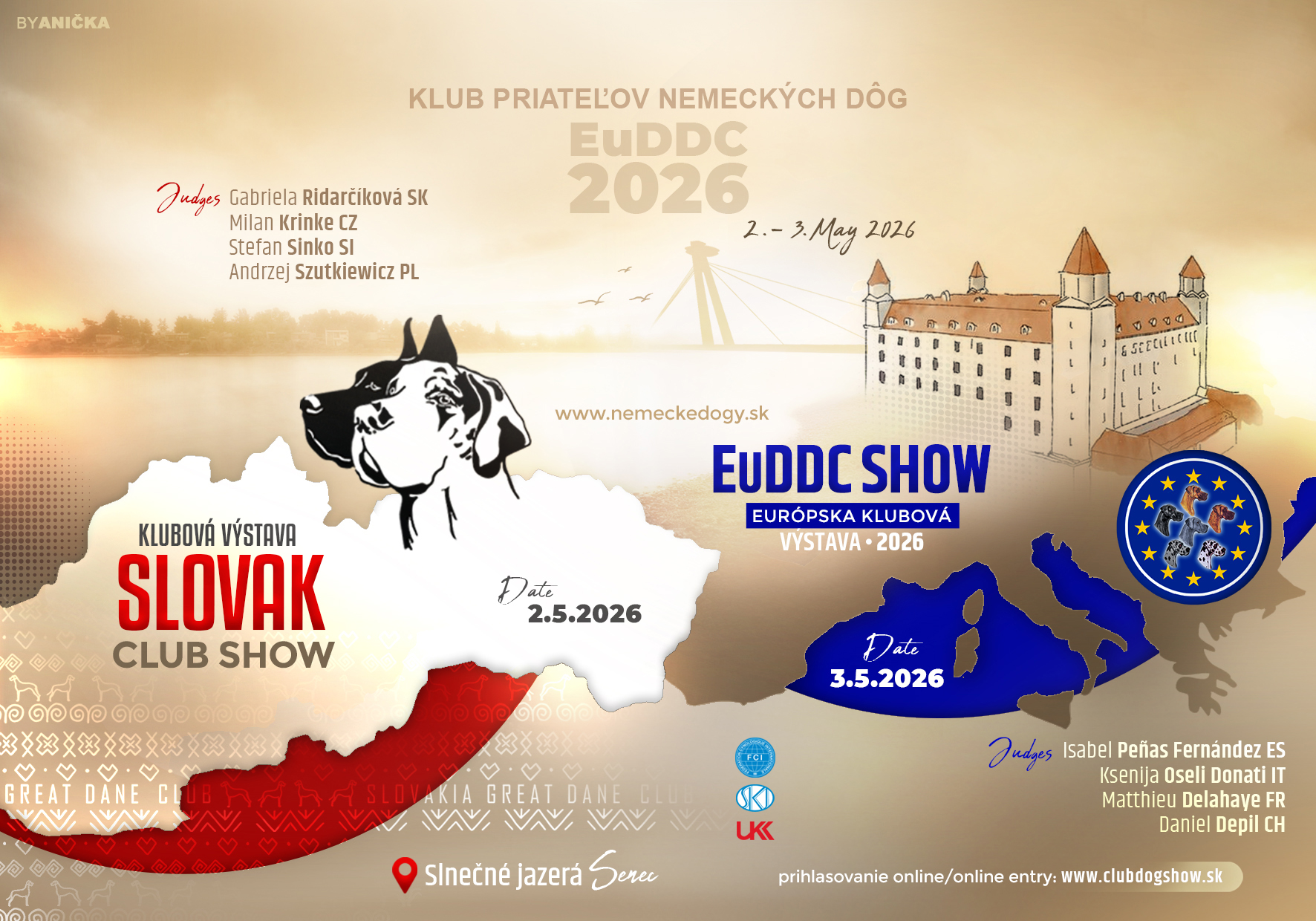 Matthieu Delahaye: Chovám nemecké dogy pod rodinným názvom chovateľskej stanice "De la légende des nymphes bleues". Hoci si cením všetky farby tohto plemena, od roku 2002 sú môjmu srdcu obzvlášť blízke modré a čierne z modrej línie. Vo Francúzskom klube nemeckej dogy (Doggen Club de France) som pôsobil ako predseda chovateľskej komisie a od úplného začiatku som bol súčasťou organizačného tímu výstavy v Neuvicu. Je mi cťou, že plemeno posudzujem už 15 rokov, a ako člen rozhodcovskej komisie som pomáhal vytvoriť "Sprievodcu interpretáciou štandardu", ktorý sa dnes používa ako referenčný dokument v mnohých krajinách. V roku 2019 som mal úžasnú príležitosť posudzovať pre Slovenský klub klubovu výstavu. Veľmi sa teším na návrat do tejto krásnej krajiny a na stretnutie s množstvom kvalitných nemeckých dôg, ktoré sa zídu na výstave EUDDC 2026. Bude mi skutočným potešením podeliť sa o tento výnimočný okamih s nadšenými chovateľmi, vystavovateľmi a priateľmi plemena.